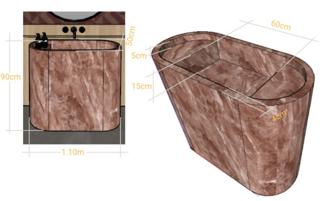 Lavabo armado - 1.10 L x 50W x 90 H cm. Tina de 60 L x 42 W x 15 H). Material: Onix Rojo Pasión